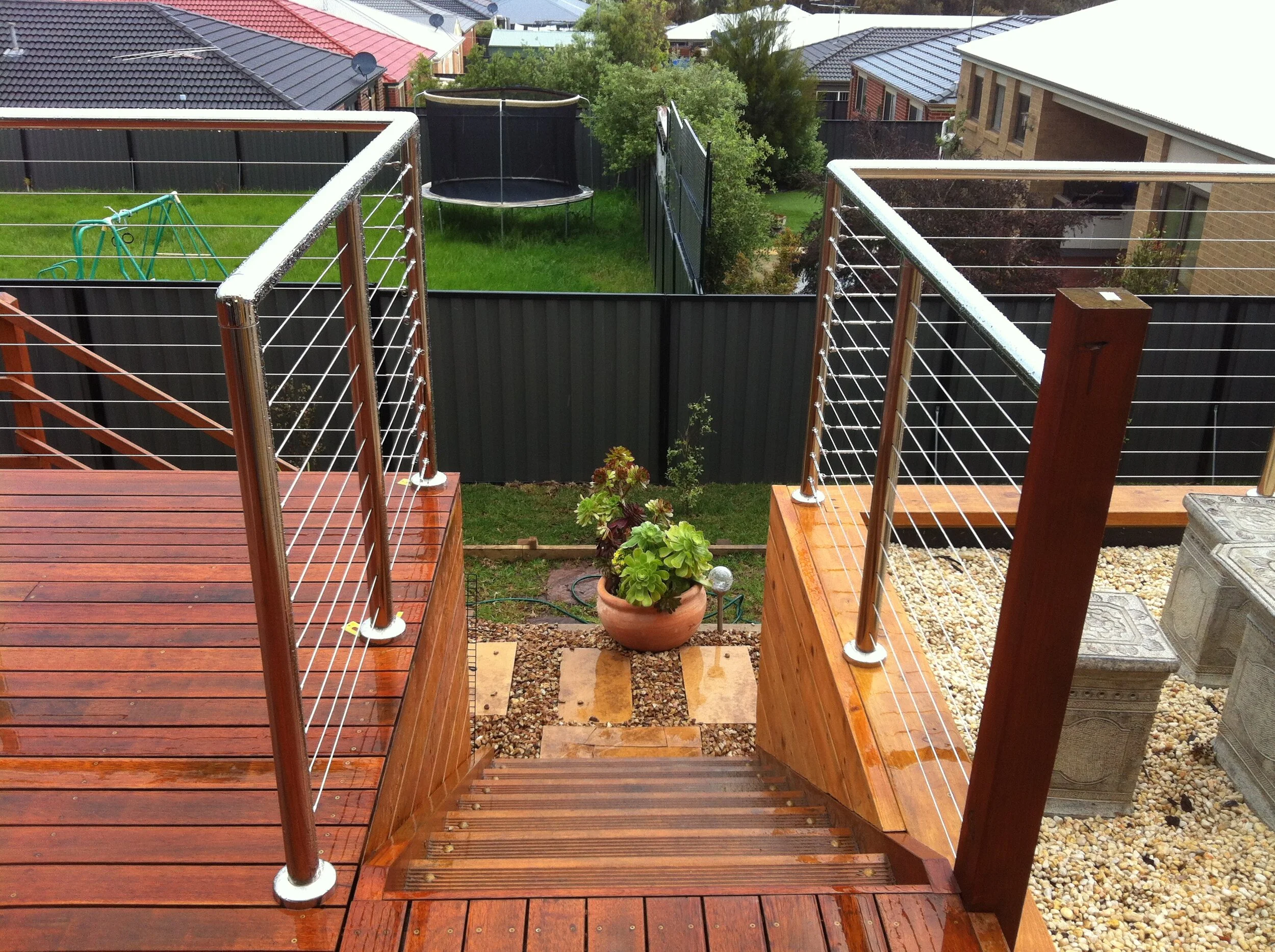 Stainless steel handrails add a great look to timber decks and staircases. We build balustrades, steps, tiered decks for all garden types.